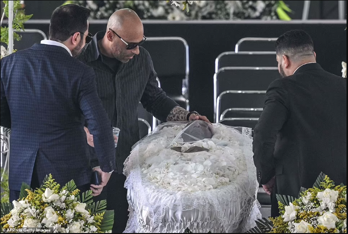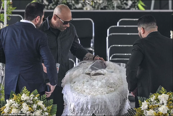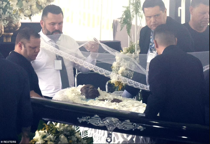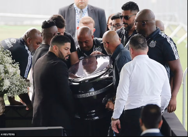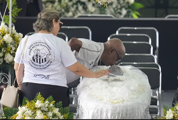 The casket arrived with Pele's son Edinho acting as one of the pallbearers, carrying it to the centre circle where it was opened to reveal the late great's body adorned with flowers. Edinho was later pictured resting his hand on his father's forehead and saying a prayer in the moments before the wake began.