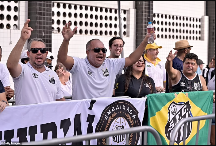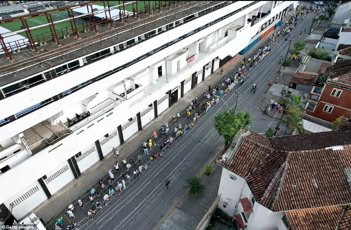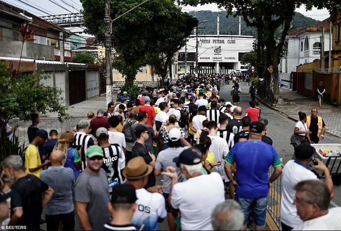The fans were pictured filing into the Vila Belmiro, home to Pele's longtime club Santos, where the open casket bearing the remains of 'The King' was displayed at the centre circle this morning and would remain for 24 hours.